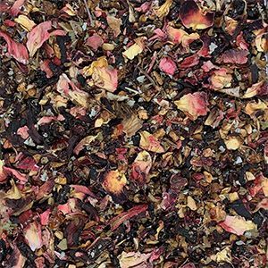 Zutaten: Holunderbeeren, schwarze Johannisbeeren und Heidelbeeren, Hibiskus, Apfelstücke, Brombeerblätter, Hagebutten, natürliches Aroma