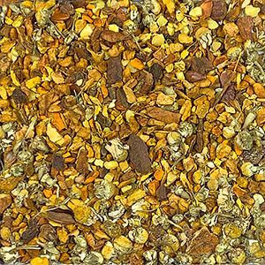 Zutaten: Apfelstücke, Kurkumawurzel, Ingwer, Zimt, Mandelstücke, Aroma, Muskatnuss, Sternanis, Nelken